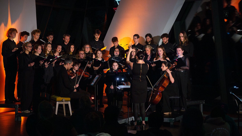 Den Takt gibt das Moor vor: dumpfes Klopfen aus der Tiefe, Vogelstimmen, Rauschen. Dazu komplexe Rhythmen, ungewohnte Klangfarben und poetische Textfragmente über die Verbindung von Mensch und Natur. Unter der Leitung von Universitätsmusikdirektorin Rebecca Lang erlebte das Publikum im Zentralgebäude der Leuphana die Uraufführung der „Cantata for an Ecosystem“ des Hamburger Komponisten Dominic Wills. Der Kammerchor der Leuphana machte ein fragiles Ökosystem hörbar - jenseits klassischer Harmonieerwartungen.