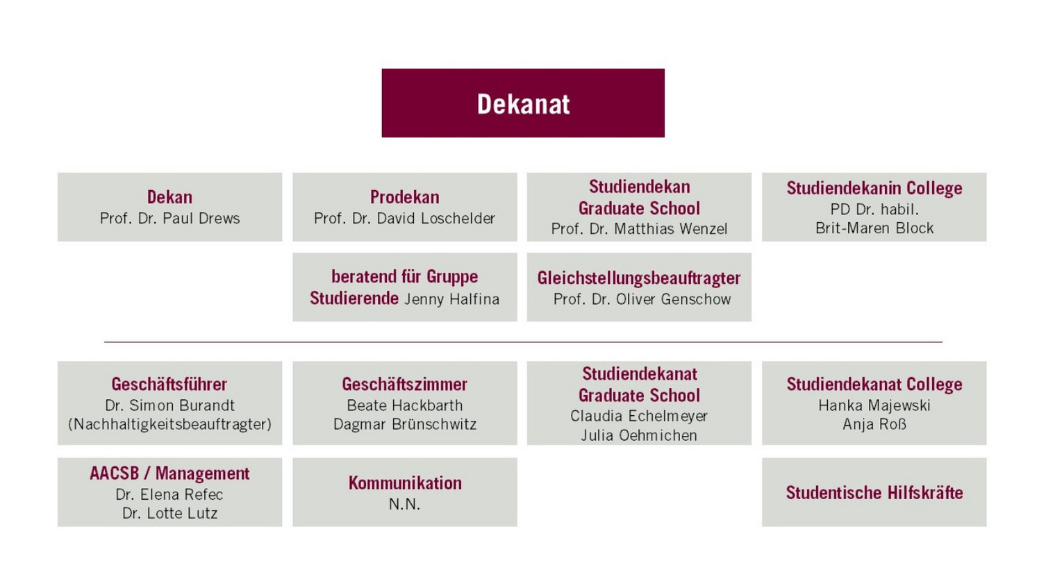 Das Dekanat besteht aktuell aus dem Dekan, einer Studiendekanin College, einem Studiendekan Graduate School und einer Prodekanin Forschung. Das Team des Dekanats gewährleistet die operative Leitung durch Dienstleistungen in den Bereichen Studium und Lehre, Verwaltung der Promotionsangelegenheiten, Finanzen, Personal, Organisation und Kommunikation und unterstützt die strategische Entwicklung der Fakultät. Die/der Studiendekan*in und ihr/sein Team befassen sich mit Ihren Fragen zum Studium. Die Fakultät Management und Technologie hat zudem drei Fakultätsbeauftragte für die Querschnittsthemen Gleichstellung, Qualitätsmanagement und Nachhaltigkeit benannt.