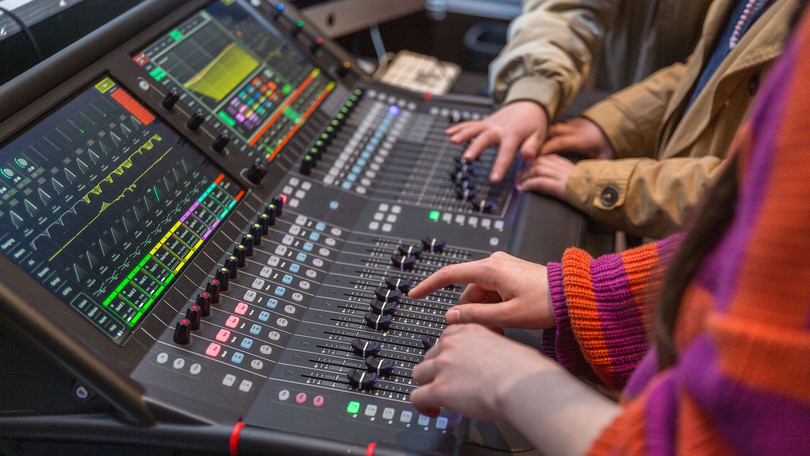 Nicht nur in der Bibliothek, sondern auch im Zentralgebäude ist viel los. Im Libeskind Auditorium flackern bunte Lichter, während eine Tonspur mal lauter, mal leiser gedreht wird. „Wir haben hier grade den Ton umgestellt und dabei verschiedene Kanäle ausprobiert“ erklärt Mia (11) und zeigt auf eines der beiden Pulte, die der AFM-Veranstaltungsservice der Leuphana aufgestellt hat. Mit dem anderen Pult versuchen sich ihre Gruppenmitglieder an der Lichteinstellung. „Wir durften einfach drauf losprobieren“ beschreibt Mia ihren Ausflug in die Veranstaltungstechnik. „Jetzt freue ich mich aber auch, gleich im zweiten Workshop noch einen anderen Beruf aufzuprobieren“.