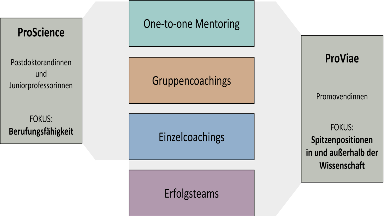 Mit den Mentoringprogrammen ProScience und ProViae werden Wissenschaftlerinnen in der Qualifizierungsphase bei Orientierungs- und Entscheidungsprozessen sowie in ihrer Kompetenzentwicklung begleitet und unterstützt, so dass sie die Weichen für den eigenen Karriereweg individuell und kompetent stellen können. Beide Programme haben eine Dauer von 12 bzw. 18 Monaten.