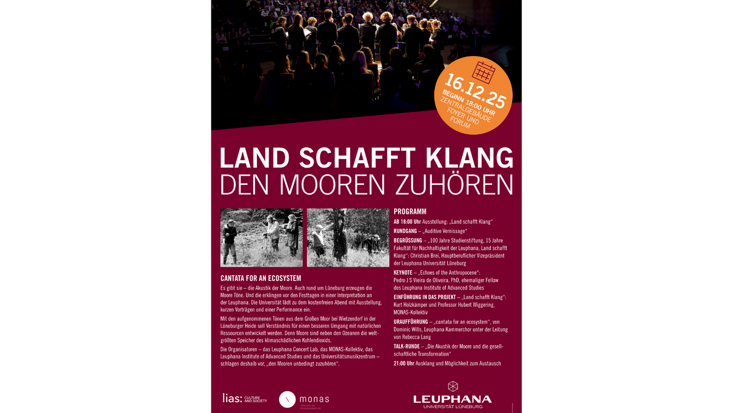 Am 16. Dezember 2025 lädt die Leuphana Universität Lüneburg zu einer besonderen Veranstaltung unter dem Titel „Land schafft Klang – Den Mooren zuhören“ ein. Ab 18:00 Uhr öffnet das Zentralgebäude seine Türen zu einer auditativen Vernissage, kurzen Vorträgen, einer Talk-Runde und der Welturaufführung der Komposition „cantata for an ecosystem“ – einer Klanginstallation, die Natur, Wissenschaft und Musik verbindet. Die Teilnahme ist kostenfrei.
