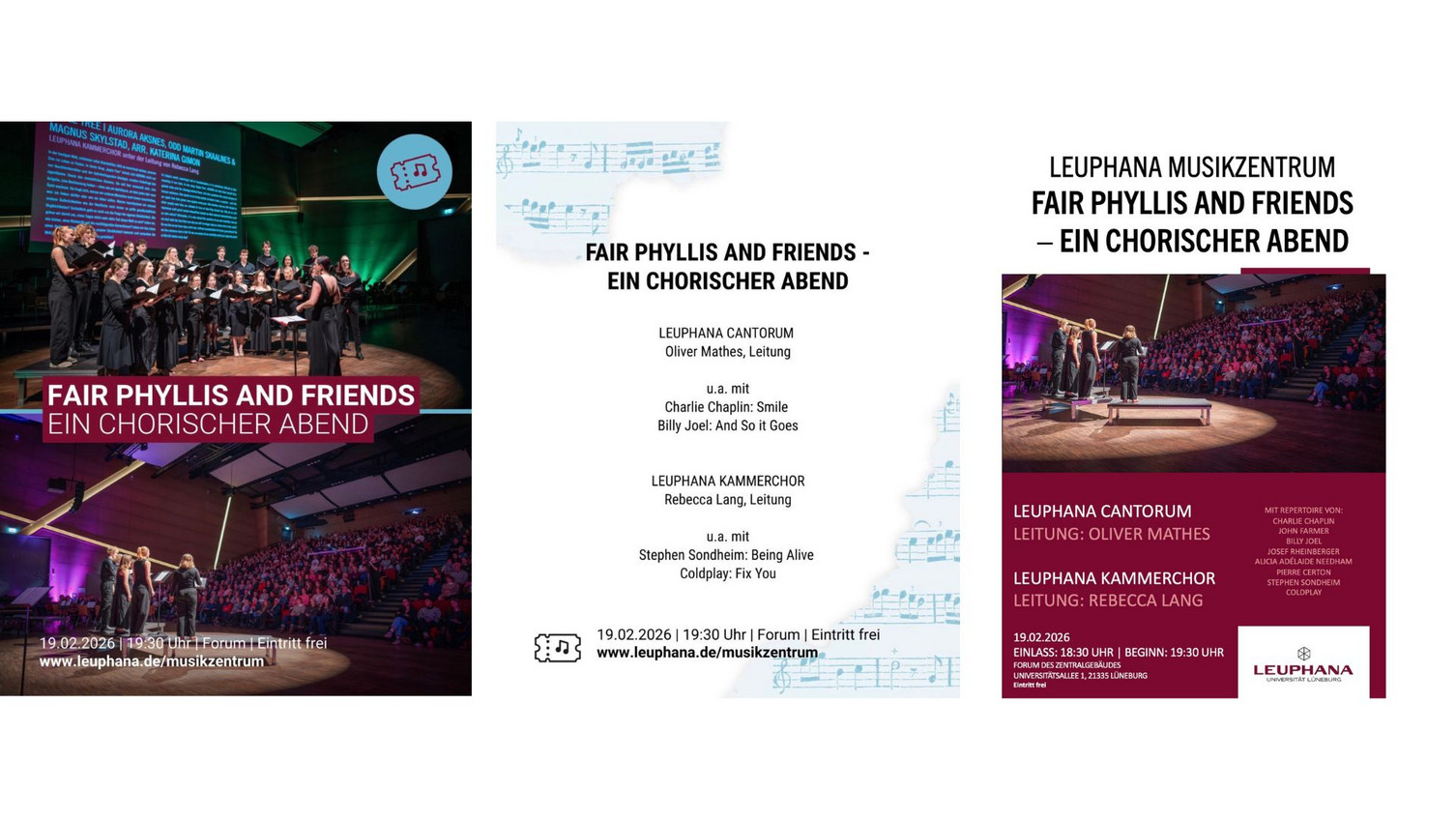 Die Musizierenden der Leuphana Vokalensembles können dieses Semester von schönen Klängen nicht genug bekommen - Sie auch nicht? Dann sind Sie herzlich eingeladen, noch einmal am 19.2.26 in das Forum der Leuphana Universität zu kommen und einen musikalischen Abend von hauchzarten Werken bis hin zu mitreißenden Pop-Arrangements zu genießen. Das Leuphana Cantorum und der Leupahana Kammerchor freuen sich, Sie mit Repertoire von Charlie Cheplin, Billy Joel, Coldplay und vielen mehr begrüßen zu dürfen!