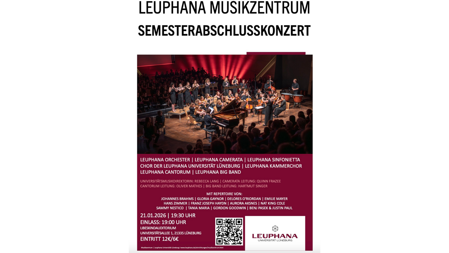 Das Leuphana Musikzentrum lädt herzlich zum Semesterabschlusskonzert des aktuellen Wintersemesters ins Libeskind Auditorium im Zentralgebäude der Leuphana Universität Lüneburg ein und präsentiert dabei einen musikalischen Abend voller Vielfalt und Kreativität mit den sieben Ensembles der Universität.
