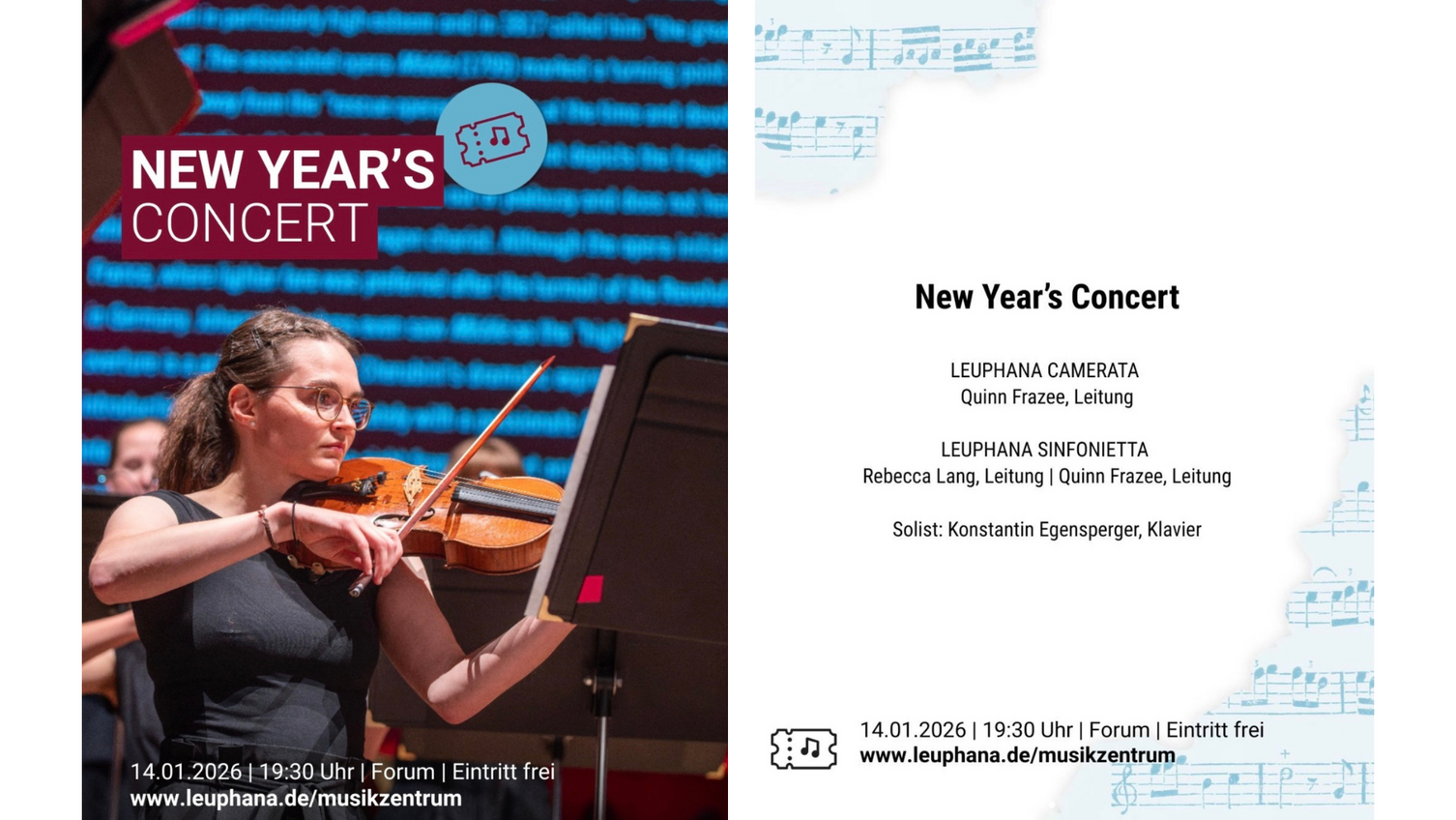 In Anlehnung an weltbekannte Neujahrskonzerte läuten an der Leuphana die Leuphana Sinfonietta & die Leuphana Camerata das neue Jahr für uns musikalisch ein. Kommt am 14.01. um 19.30 Uhr ins Forum des Libeskind-Gebäudes und und lauscht Stücken von Joseph Haydn und Aaron Copland.