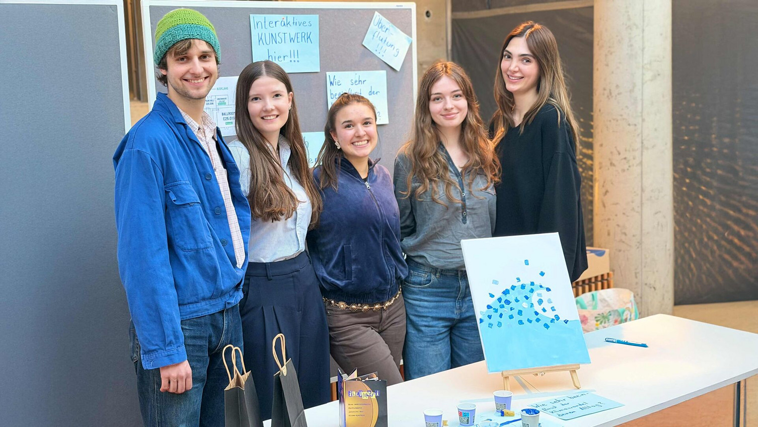 A small crowd has also gathered in front of the stand run by Rebecca Flügge, Josephine Saleh, Milena Wigger, Felix Weileder, and Sayna Ghasemi Hamed. The five first-semester students are one of 280 project groups presenting their results from the Leuphana semester at the Gallery Walk. All 1,500 first-semester students started their studies in October 2025 with a project-oriented Opening Week on campus.