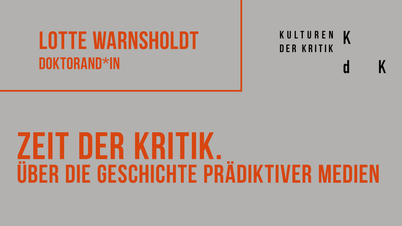 In digitalen Kulturen verschiebt sich das Denken auch hinsichtlich der Vorstellung zeitlicher Ordnungen. Anhand einer Untersuchung der Geschichte prädiktiver Medien wirft Lotte Warnsholdt in ihrer Dissertation die Frage auf, inwiefern diese Verschiebung das Vermögen, den Anspruch und die Geltung moderner Kritikbegriffe bedroht. Mit einer historischen Perspektive, die nach dem 2. Weltkrieg einsetzt, denn in diesem entwickeln sich mit Wieners Arbeit an Heeresgerät auf US-amerikanischer Seite die ersten kybernetischen „Medien der Prädiktion“, d.h. Technologien der Zukunftsberechnung, wird das Spannungsfeld zwischen Kontrollparadigma und offenem Gestaltungsraum betrachtet. Der deutsche Historiker Reinhart Koselleck, der die Katastrophe des Krieges zum zentralen Ausgangspunkt seiner Arbeiten macht, bildet die zweite Referenz der Arbeit. Mit Koselleck lässt sich einerseits das Projekt der Kritik, das aus der Aufklärung hervorgegangen ist, und der „offene Gestaltungsraum“, der für die Realisierung von Kritik notwendig scheint, beschreiben.