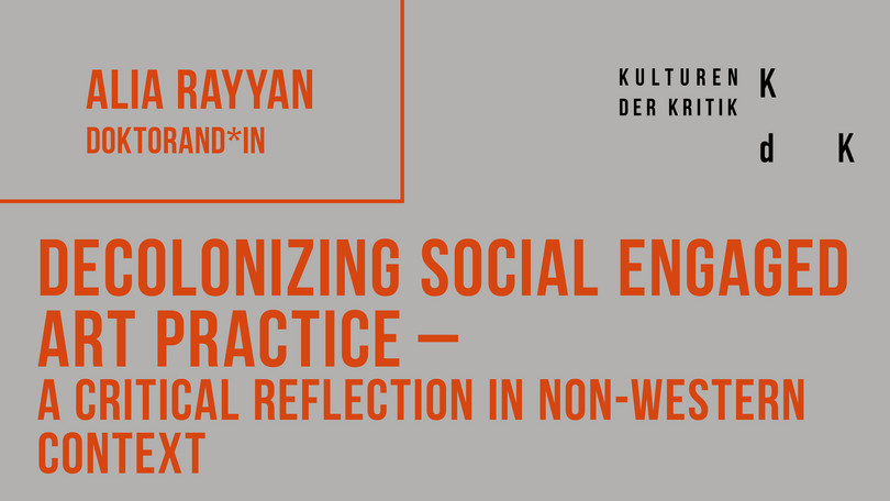 Gegenstand der Dissertation sind die partizipativen Kunstinterventionen der palästinensischen Kunstorganisation Alhoash in der Altstadt von Jerusalem, die die Doktorandin Alia Rayyan in ihrer ehemaligen Position als Direktorin und Kuratorin von 2013 bis 2015 mitinitiiert hat und die Fragestellung, inwiefern partizipative Kunstinterventionen als Methoden und Formen des Dissens bezeichnen werden können, um gesellschaftlich relevanten Protest am Status Quo zu aktivieren.