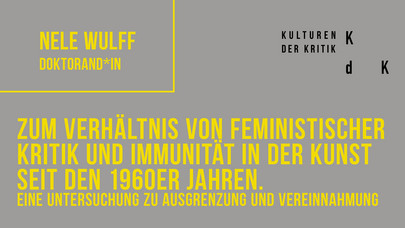 The dissertation project is interested in the concept and the practice of immunization in the context of art and criticism. In pursuing the question of feminist criticism and immunity in art from the late 1960s to the present, the study traces a double movement. On the one hand, it investigates the extent to which feminist criticism has since that time simply been incorporated by existing institutions without any fundamental structural change taking place. On the other hand, it inquires into the immunization strategies by means of which women artists have tried—and continue to try—to avoid such institutional coopting.