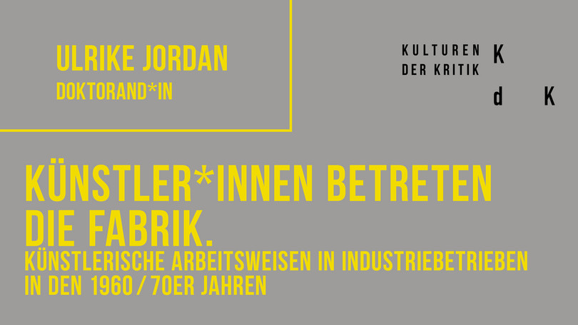 The shift in the site of artistic work from the studio to the factory is symptomatic of a category of art practices that had become increasingly prominent in this period, whose focus was primarily on performative, processual and context-based methods. However, in this context it was not only discussions about conceptual practices that were important; the shift often resulted from an increased attention to the relationship between art and society, and a critical interrogation of the functions that art performed in relation to its wider social context. In my dissertation I review these factory interventions, critically evaluating the diverse artistic and political approaches artists (and arts organizations) adopted. How did the boundaries between art and society, as well as between artists and workers, become visible? Which (productive) moments of friction—also in relation to differently situated knowledges—arise in the interactions between artists, workers and management? Additionally, to what extent can these interventions also be understood as a critique of the conditions of production and reception of art itself? On the one hand, the practices examined must necessarily be put in relation to contemporary discussions concerning socially engaged art and in part critically delimited; on the other hand, they must be analyzed in terms of the extent to which more recent discussions around neoliberal incorporations of "creativity" within value chains are relevant to these practices, or were even nominally anticipated by them.