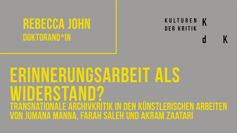 My dissertation focusses on archival critique in art that addresses the production of cultural identity in the context of crises and (post)war situations in Lebanon and Palestine/Israel, thereby narrating transnational histories of the region. The critical potential of artistic engagement with the archive will be examined through an analysis and regionally specific contextualisation of selected works by Jumana Manna, Akram Zaatari and Farah Saleh. I would like to demonstrate how the archival works produce various alternative narratives, against the background of a failure of local memory politics, national identity constructions, and universalistic history writing: through their method, content and form, the works can be analysed through the lens of oral history, connected histories (Subrahmanyam 1997), positioned knowledge (Hall 1994), and situated knowledge (Haraway 1988).