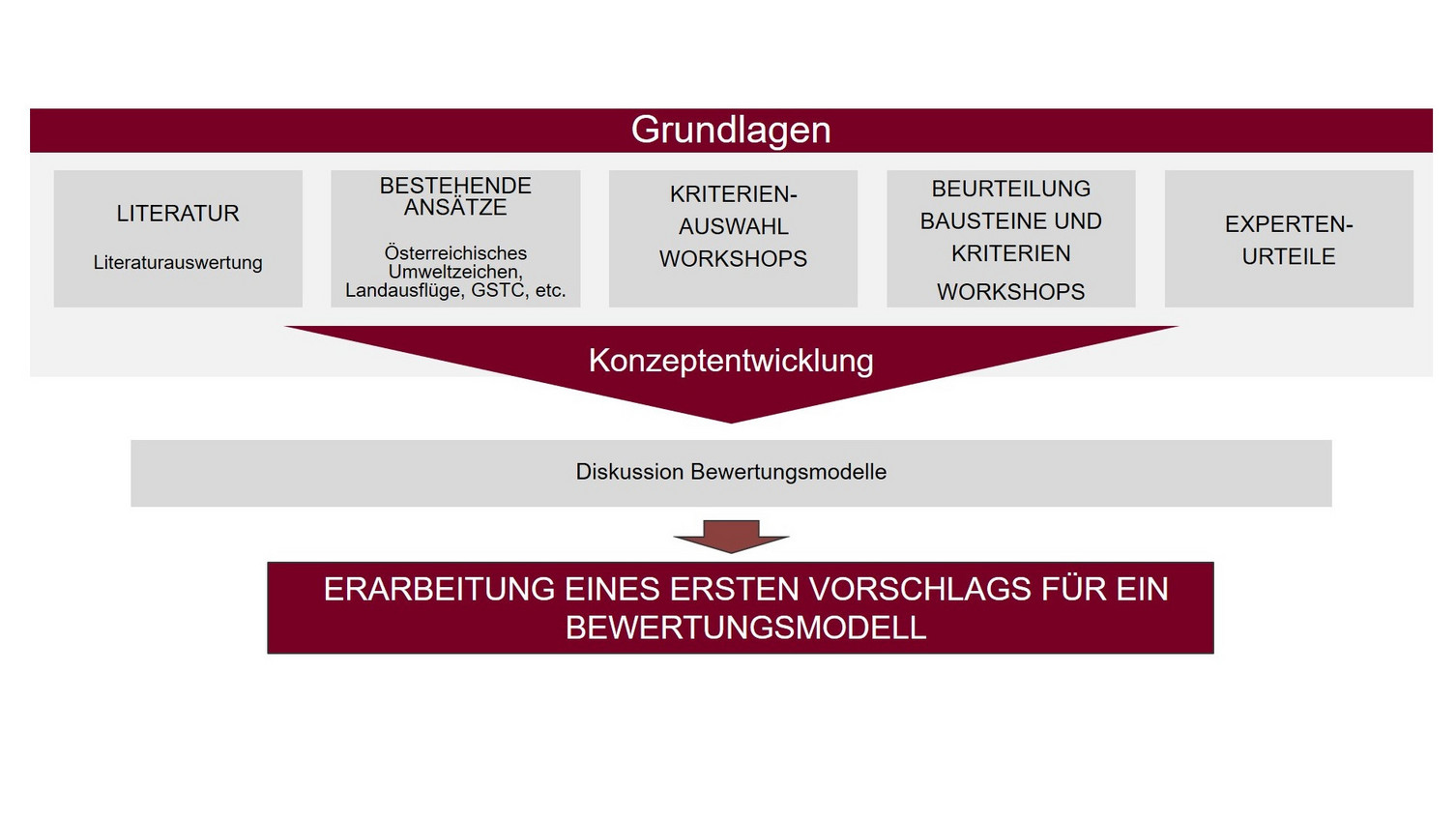 In recent months, the project team further developed and refined the evaluation model for assessing the sustainability of travel packages. In the process, the results of the workshops, the survey and further considerations were incorporated into the conceptual design of the model.
