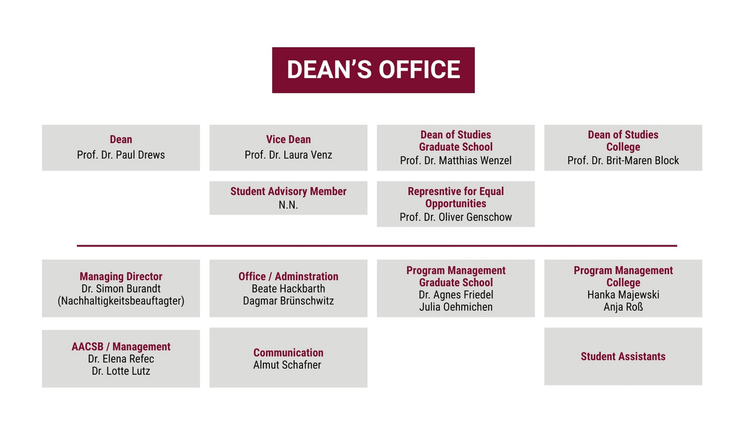 The Dean’s Office is responsible for the administration of the school and implements the decisions of the Faculty Council. The team of the Dean’s Office supports you in all questions concerning the School of Management and Technology!