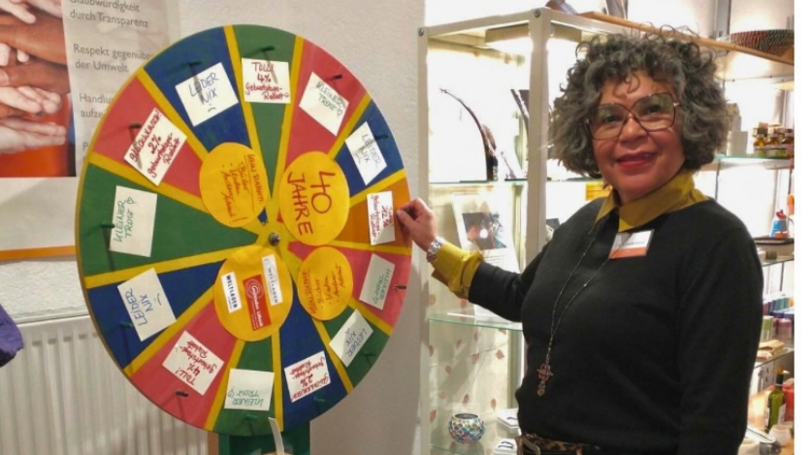 Inspired by the team's new ideas, the employees set up a wheel of fortune at the aforementioned festival, offering various discounts. Depending on the colour on which the wheel stopped, there were different thematic questions (about the shop, about fair trade). Those who answered correctly then received a percentage off a purchase in the shop.