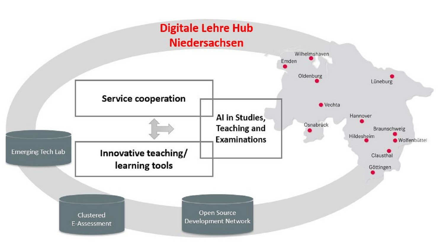 The “Digitale Lehre Hub Niedersachsen” project promotes long-term cooperation between Lower Saxony's universities in the field of digital teaching. It is an important pillar in the development of Hochschule.digital Niedersachsen (HdN).