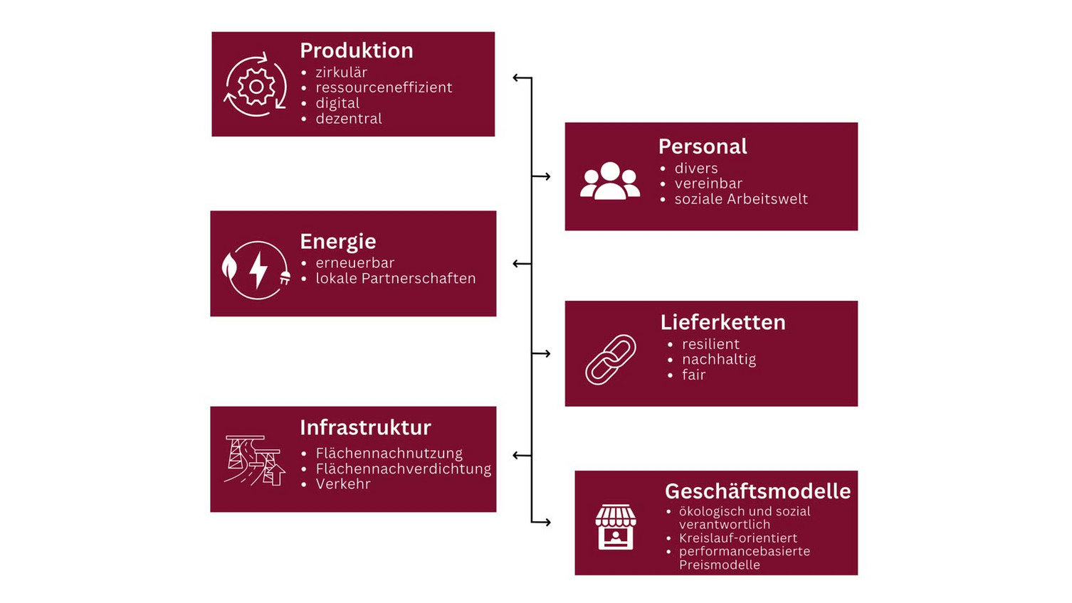 Im Rahmen des Innovationsnetzwerks werden zentrale Handlungsfelder wie Produktion, Lieferketten, Energie, Personal, Infrastruktur und Geschäftsmodelle gemeinsam betrachtet. Nachhaltigkeitsmanagement wird dabei nicht als isoliertes Thema verstanden, sondern als gleichrangiger Treiber neben Digitalisierung und Organisationsentwicklung.