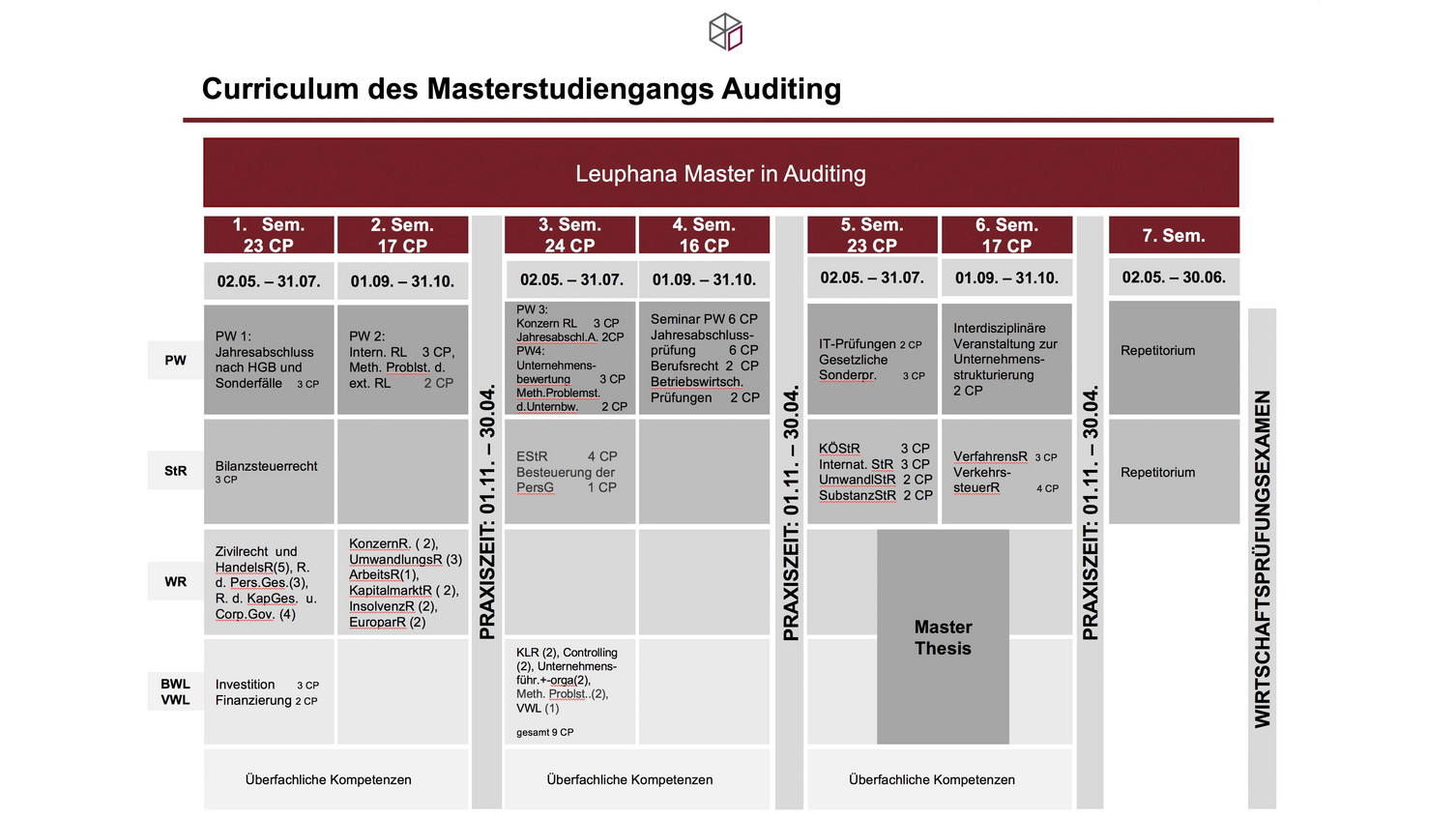 Das dreijährige Studienprogramm, das daneben natürlich auch Mitarbeiter*innen mittelständischer Wirtschaftsprüfungsgesellschaften offen steht, verläuft phasenweise im Wechsel zwischen Wissenschaft und Praxis. Das Curriculum basiert auf der Vermittlung wirtschaftsprüfender und steuerberatender Kompetenzen und besitzt daneben auch einen betriebswirtschaftlichen und juristischen Schwerpunkt. Den Anforderungen gerecht wird die Leuphana u.a. durch die gezielte Auswahl von Dozierenden mit langjähriger Berufserfahrung in Wissenschaft und/oder Praxis sowie der Mitgliedschaft in der Prüfungskommission zum Wirtschaftsprüfungsexamen. Darüber hinaus kommen z.B. moderne Formen des E-Learnings, Kleingruppendidaktik und das Training über Fallstudien zum Einsatz. Neben dem Pflichtcurriculum gibt es eine Reihe weiterer spezifischer Angebote für die Studierenden, die in interaktiven Formaten laufen und beispielsweise die großen Grundkonflikte thematisieren wie Digitalisierung oder Ethik. Das Curriculum beinhaltet was für ein erfolgreiches Abschneiden im WP-Examen notwendig ist, ergänzt um Themen und Formate, die helfen können die Prüfungspraxis erfolgreicher zu gestalten - entlang gut begründeter Prinzipien und offen für all die Herausforderungen von neuen Geschäftsmodellen.