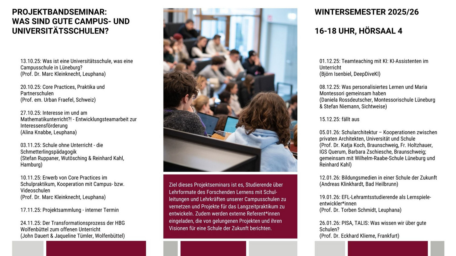 Das Seminar “Was sind gute Campus- und Universitätsschulen? Wie lassen Sie sich weiterentwickeln?” untersucht im Laufe von drei Semestern, was gute Campus- und Universitätsschulen auszeichnet. Im ersten Semester wird Studierenden mit dem Lehrformat des Forschenden Lernens die Möglichkeit geboten, sich mit Schulleitungen und Lehrkräften zu vernetzen, gemeinsame Projekte zu planen und von Gastreferent*innen Einblicke in gelungene Schulprojekte und Visionen für die Schule der Zukunft zu erhalten. Auch die internationale Perspektive, wie z. B. durch den Vortrag von Prof. em. Urban Fraefel (Schweiz) kommt nicht zu kurz.