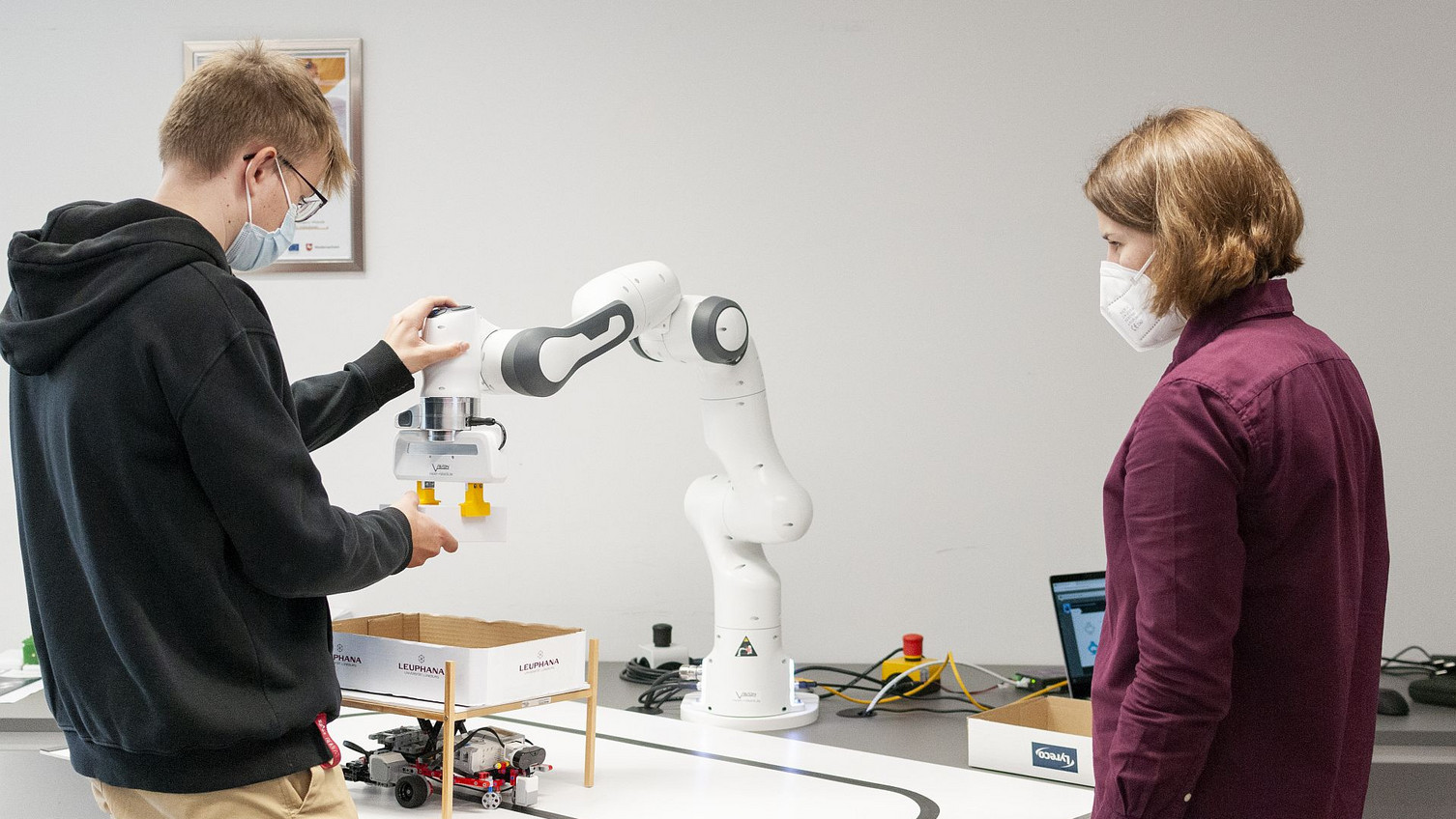 Im zweiten Teil des Workshops, unter der Leitung von Nora Heinig-Niemeyer, konnten die Schüler*innen in der roboterfabrik Lüneburg die Arbeit mit einem kollaborierenden Roboter kennenlernen. Hier hatten die Schüler*innen die Möglichkeit mit der sogenannten online Programmierung direkt dem Roboter die Befehle einzuspeichern. Das Ziel des zweiten Teils war die Entnahme der Ladung vom Lego-Roboter durch den kollaborierenden Roboter und das Verpacken der Ladung in eine Versandbox.