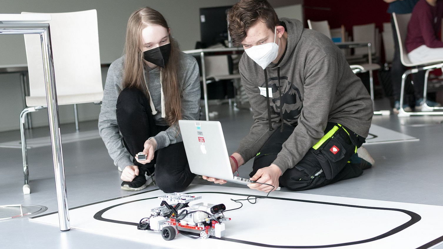 Unter der Leitung von Prof. Dr. Lin Xie konnten die Schüler*innen im ersten Teil des Workshops lernen, wie sie einen Lego-Mindstorms Roboter so programmieren, dass er sich entlang einer farbig markierten Linie bewegt. Hierfür haben die Schüler*innen eine Einführung in die Programmiersprache Python erhalten und konnten das neu erworbene Wissen direkt praktisch anwenden. Ziel dieser Aufgabe war, dass der Lego-Roboter eine Ladung zum kollaborierenden Roboter transportiert.