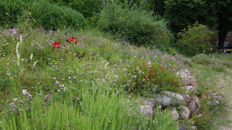 Der Biotopgarten wagt einen Balanceakt zwischen wilder Natur und gebändigter Kultur. Durch die Anlage unterschiedlicher Elemente aus Natur- und Kulturlandschaft ist aus der ehemals asphaltierten Fläche eine bunte Welt "en miniature" geworden. Neben reinen Kulturelementen wie dem Bauerngarten mit Gewürz- und Heilkräutern, den Gemüsebeeten der studentischen Initiative „Essbarer Campus“ und der Streuobstwiese mit zehn alten, hochstämmigen Apfelsorten finden sich auch natürliche Sukzessionsflächen, Freiwasser- und Uferhabitate als Vertreter natürlicher Landschaftselemente der Region. Vom Teich über Trockenrasen bis hin zum lichten Wald finden sich hier unterschiedlichste Lebensbedingungen. Auf einem kleinen Modell-Acker haben sogenannte Segetalarten (Ackerbegleitkräuter) einen eigenen Lebensraum. Die Vielzahl der verschiedenen Standortverhältnisse bietet einer Vielzahl heimischer Arten einen Lebensraum und führt insgesamt zu einer hohen Diversität in dieser Anlage. Dieses Konzept verfolgt damit das Ziel, nicht nur einen Pausen- und Erholungsort, sondern auch einen Ort zu schaffen, an dem auf die Artenvielfalt vor der eigenen Haustüre und ihre Schutzwürdigkeit aufmerksam gemacht wird. Als Lernort und Freilandlabor für Studierende erfüllt der Garten eine wichtige Funktion bei der Wissensvermittlung. Nur wer die unterschiedlichen Pflanzen- und Tierarten kennt, einen emotionalen Zugang zu ihnen hat und letztlich auch die Bedeutung und den Nutzen für unsere Existenz auf diesem Planeten erkennt, wird sich für ihren Erhalt erfolgreich einsetzen können.