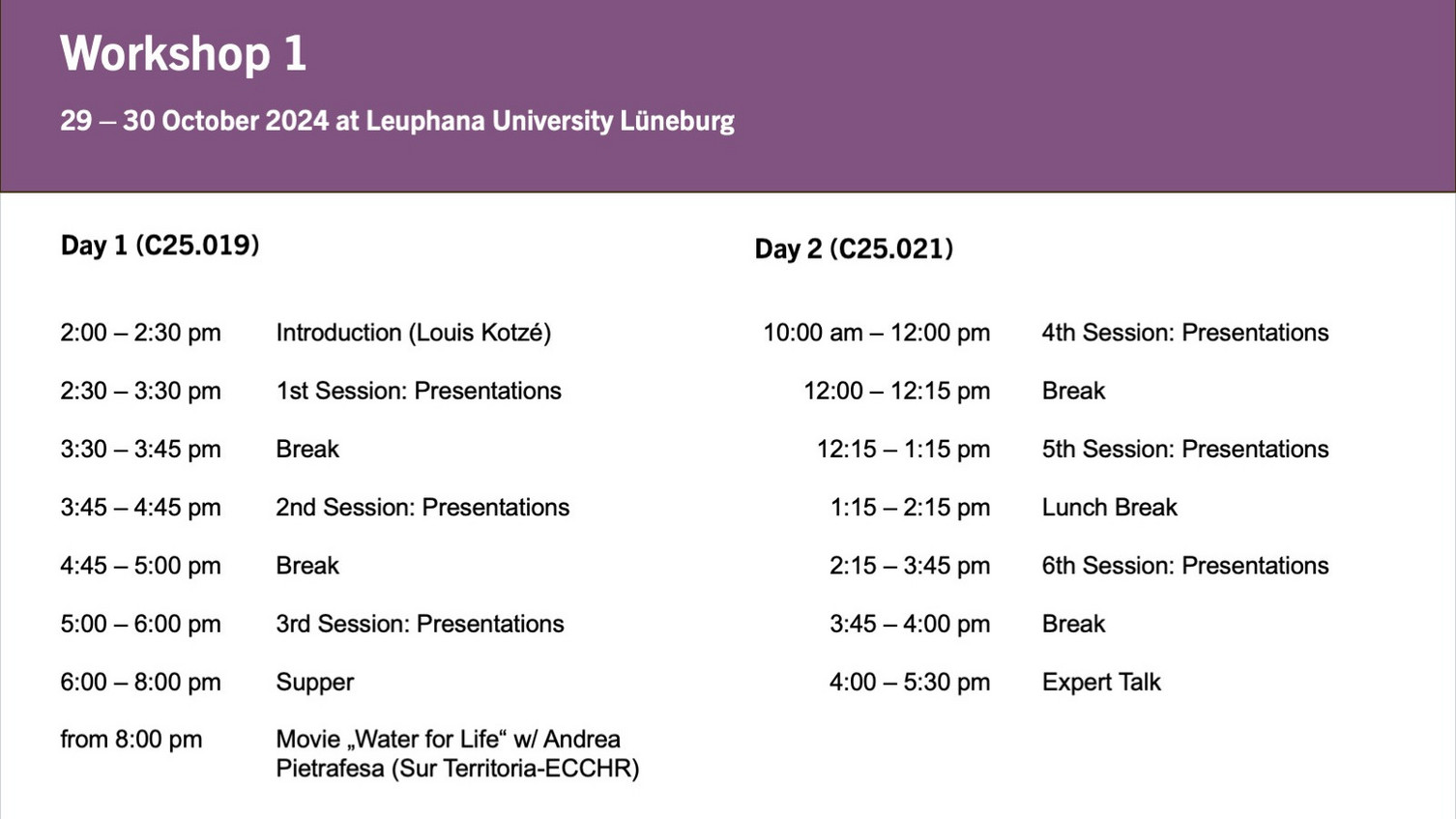At the first workshop on 29 - 30 October 2024, participants will present rough ideas for a paper. In an interim meeting (online) on 10 December 2024, they will discuss their progress and findings in small groups. In early April 2025, they will meet again to present their final papers and participate in a panel discussion at Leuphana University. At the end of the workshop phase, the participants' papers will be published in an edited collection.