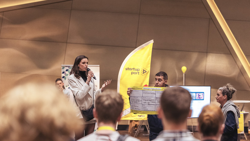 Im interaktiven Programmteil waren die Teilnehmenden aufgerufen, sich „Ideation Challenges” zu widmen. Dazu waren bereits im Vorweg von den Startup-Port-Verbundeinrichtungen verschiedene gesellschaftliche Herausforderungen formuliert worden – jeweils mit Bezug zu ökologischer oder sozialer Nachhaltigkeit. Das Themenspektrum reichte dabei von Gesundheit bis zu nachhaltigem Bauen. In bunt zusammengewürfelte Teams erarbeiten die Teilnehmenden innovative Lösungsideen. Hilfestellung boten ihnen dabei Kreativstände auf dem „Marktplatz der Inspiration“ mit einer Fülle von Materialien und Denkanstößen für den Arbeitsprozess. „Diese Session hat gezeigt, wie eine fruchtbare Zusammenarbeit zu innovativen Lösungen führen kann: Trotz anfänglicher Unsicherheiten fanden die Teilnehmenden durch aktives Networking und intensiven Ideenaustausch zusammen und erarbeiteten effektiv innovative Lösungen, was die Challenges zu einem vollen Erfolg machte”, resümierte die Moderatorin Tatjana Timoschenko.