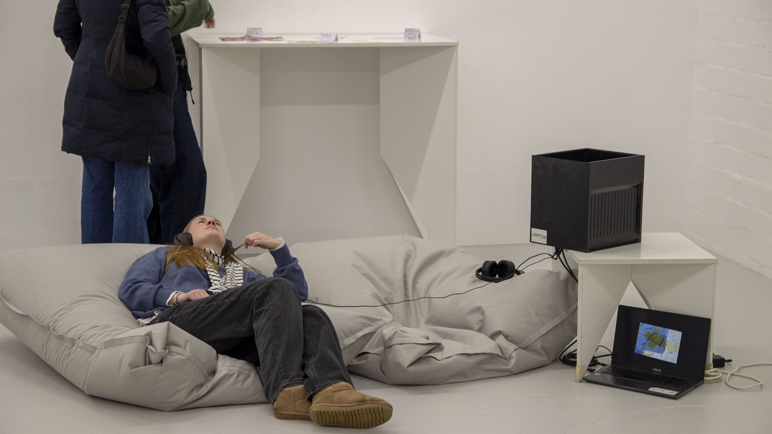 Aus ihren Forschungsergebnissen entwickelten sie eine ‚Blitzausstellung‘, die am 05. Februar 2026 in der Halle für Kunst eröffnet wurde. Die aus ihrer Forschung entstandenen Ausstellungsobjekte verhandeln Themen wie das Sitzen im Stadtraum, das Formen temporärer Gesellschaften, das Markieren des öffentlichen Raumes durch Sticker und Hunde oder die ungeschriebenen Regeln und Normen von Kulturinstitutionen. Dabei traten die Ausstellungsobjekte in einen Dialog mit einer Ausstellung von Samuel Bich, welche ausgehend von archivarischer Forschung die Produktions- und Präsentationsbedingungen zeitgenössischer Kunst hinterfragte.