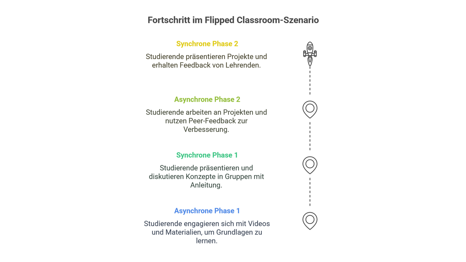 Die beiden asynchronen und synchronen Phasen sind so gestaltet, dass sie jeweils gezielt aufeinander aufbauen. Studierende müssen sich aktiv einbringen und eigenständig arbeiten, während die synchronen Phasen für vertiefte Interaktion und Feedback genutzt werden. Die klare Struktur und fortlaufende Verbindung der Phasen sorgen dafür, dass die Studierenden den Lernprozess als ganzheitlich wahrnehmen.