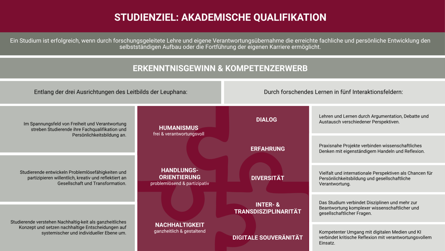Das Profil der Leuphana ist das auf eine umfassende Bildungsidee gründende Leitbild einer humanistischen, nachhaltigen und handlungsorientierten Universität gekennzeichnet. Ihren ganzheitlichen Bildungsanspruch realisiert die Leuphana mit einem deutschlandweit originären Studienmodell, das fünf Fakultäten über drei Schools (College, Graduate School, Professional School) miteinander verbindet.