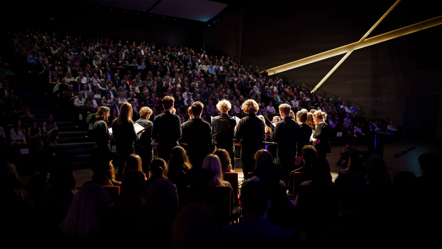 Gedimmtes Licht, feierlich gekleidete Gäste, herzliche Umarmungen und Vorfreude – für die 420 Absolvent*innen des College ist die Graduiertenfeier der krönende Abschluss der Bachelorzeit. Der Auftritt des Leuphana Kammerchors im Libeskind Auditorium greift die festliche Stimmung auf vertieft sie.