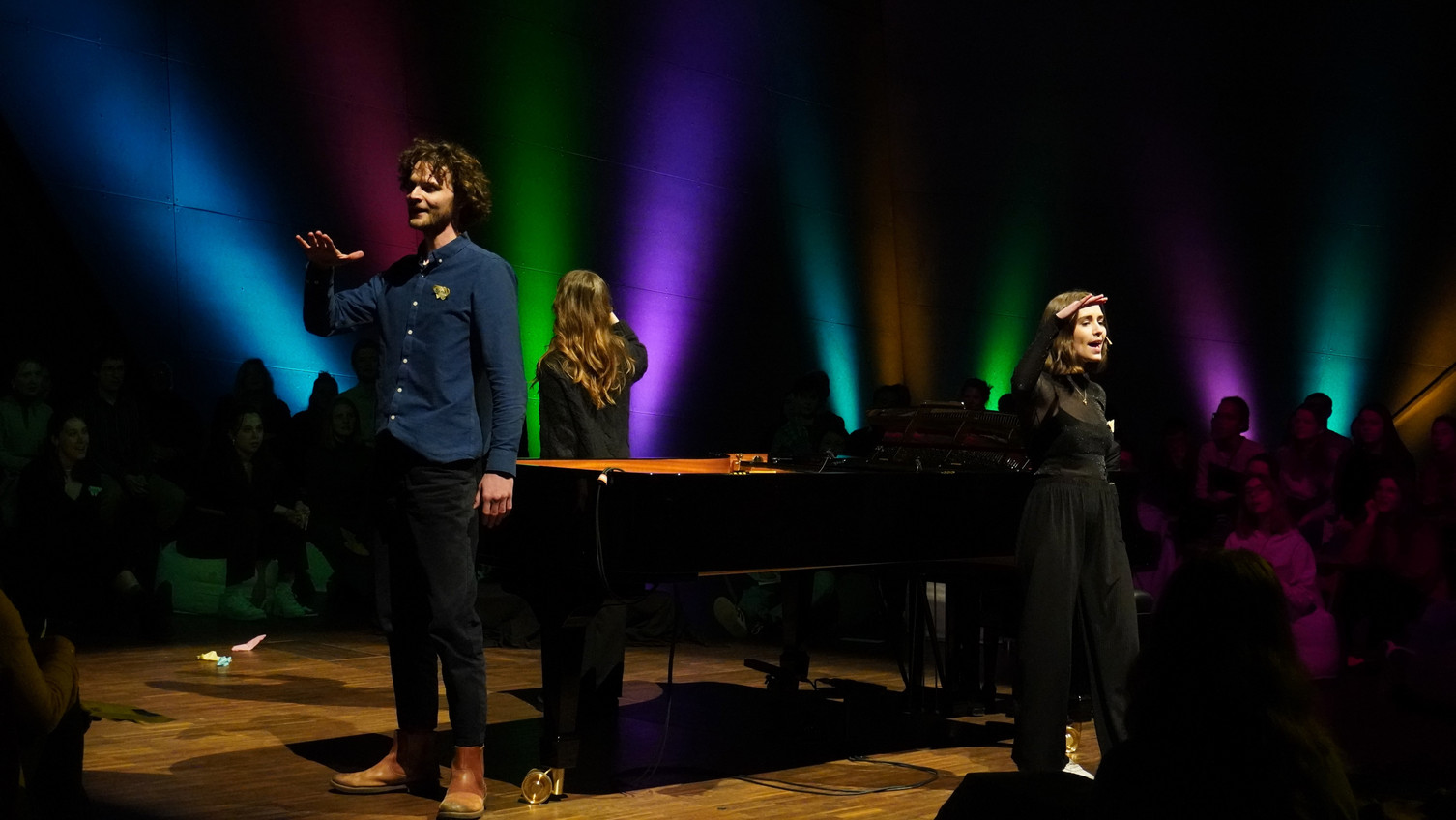 Das Publikum nahm zunächst auf der Tribüne Platz und lauschte Viktor Soos, der mit Johann Sebastian Bachs „Aria“ aus den Goldberg-Variationen den Abend eröffnete. Doch der Konzertbesuch blieb nicht statisch: Die Gäste wurden eingeladen, sich auf die Bühne zu bewegen und die Musik aus unmittelbarer Nähe zum Flügel zu erleben. Mit Werken von Emilie Mayer, Amy Beach und Alban Berg steigerte sich die musikalische Spannung bis hin zu Arnold Schönbergs „Sechs kleine Klavierstücke op. 19“, bevor der Abend mit Maurice Ravels „Miroirs M. 43“ und Fanny Hensels „Allegretto“ aus der Melodie op. 4 Nr. 2 seinen Abschluss fand. Zwischen den Musikstücken durchzogen kurze Live-Redebeiträge der Seminarteilnehmer:innen die Aufführung, die den thematischen Rahmen des Konzerts vertieften und zum Nachdenken anregten. Auch das Publikum wurde aktiv einbezogen, u.a. durch gemeinsames Singen.