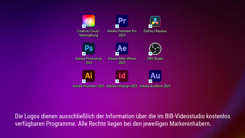 Der PC-Arbeitsplatz im Studio ermöglicht eine professionelle Postproduktion von Video- und Audioaufnahmen. Dafür ist der PC mit einer Vielzahl von lizenzierten Bearbeitungsprogrammen ausgestattet: