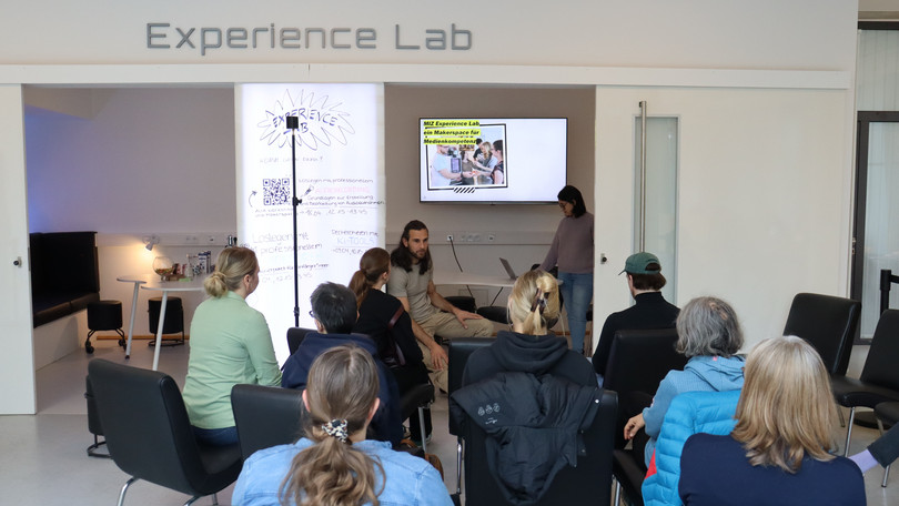 Im Experience Lab (Foyer der Bibliothek, Obergeschoss) finden regelmäßig Workshops zu verschiedenen Themen der Mediengestaltung statt – darunter Erstellung von Video- und Audioaufnahmen, Videoschnitt, 3D-Design sowie der Einsatz von Künstlicher Intelligenz in kreativen Prozessen.