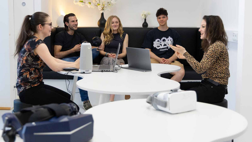 Das Studio des Studiengangs Digital Media ist mit vielseitiger Technik zum Experimentieren und Ausprobieren ausgestattet. Es verfügt über einen 3D-Drucker, Laptops für Videoschnitt, Konsolen, VR-Brillen.