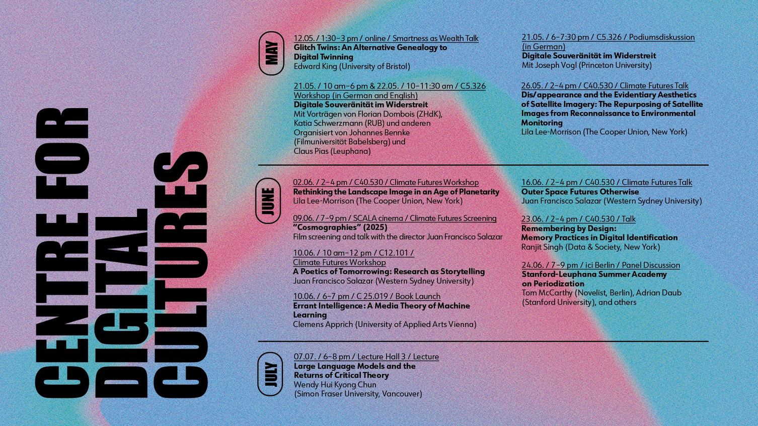Die Veranstaltungen am Centre for Digital Cultures (CDC) widmen sich zentralen Fragen der Digitalkultur sowie den Auswirkungen der gegenwärtigen Polykrise auf das gesellschaftliche Leben und weiterführend auf kulturwissenschaftliche Fragestellungen und Forschungsgegenstände. Besonderes Augenmerk wird dabei auf die Verwicklung digitaler Medientechnologien in diese Krisen gelegt.